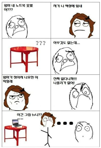 그림에서 아들은 분명히 책상 위에 노트북이 없는 것을 확인했지만 엄마는 노트북을 금방 찾는다.