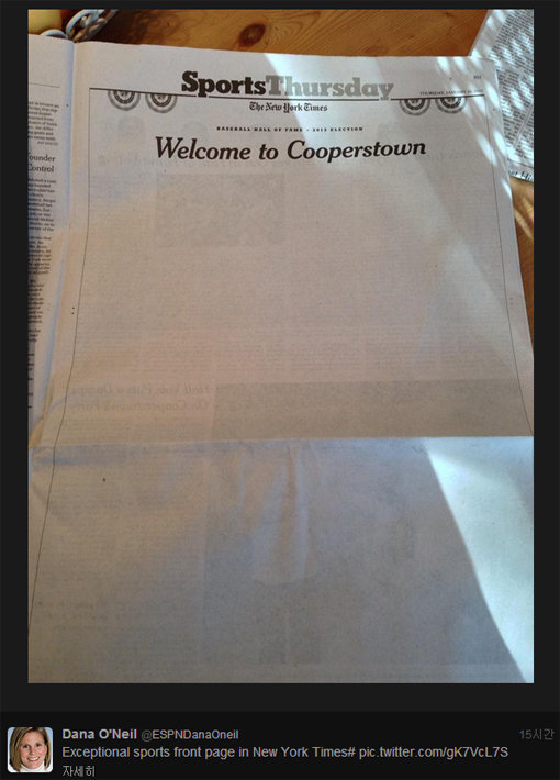 쿠퍼스타운은 메이저리그(미국프로야구) 명예의 전당 박물관이 위치한 곳. 신문은 2013년 명예의 전당 투표 결과 올해 명예의 전당에 입성한 선수가 이 텅빈 지면처럼 아무도 없었다는 소식을 파격 편집으로 독자들에게 전한 것이다.