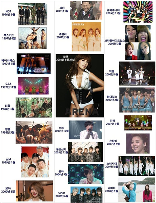 게시물에 따르면 1996년 H.O.T를 시작으로 ‘1세대 아이돌’의 전성기인 1997년에는 젝스키스, 베이비복스, SES가 데뷔했다. 그 뒤 신화와 핑클(1998), god(1999) 등이 등장했다.