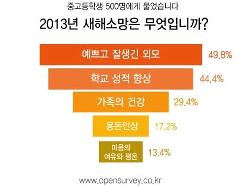 10대 새해 소망 조사 결과 49.8%의 설문 참여자가 ‘예쁘고 잘생긴 외모(49.8%)’를 꼽아 1위를 차지했다. 설문자 절반에 가까운 10대 학생들이 ‘외모’에 큰 관심을 가지고 있는 것으로 나타난 것.