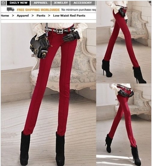 공개된 사진에는 여성의류를 팔고 있는 실제 쇼핑몰의 한 페이지가 캡처되어 있다. 붉은색 바지에 킬힐을 착용하고 있는 여성은 날씬한 몸매를 뽐내며 의류를 선전하고 있다.