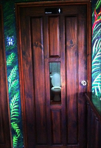 공개된 사진에는 여자 화장실의 외부를 촬영한 모습이 담겨 있다. 그런데 여자 화장실 출입문의 가운데가 훤하게 뚫려 있어 웃음을 자아냈다.