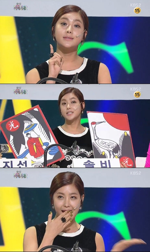 솔비는 “본명은 권지안, 예명은 솔비. 우리 할아버지께서 태명으로 지어주셨다”며 화투패를 꺼내 관객을 폭소케 했다.