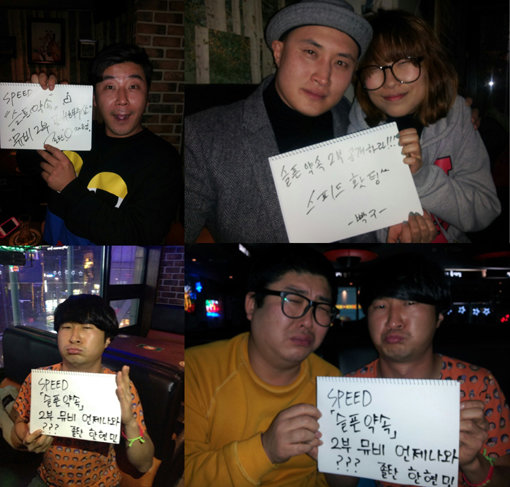 공개한 사진 속에서 개그맨 이재형, 한현민, 나상규, 윤성호 그리고 ‘여자 유해진’ 개그우먼 이세영 등은 스피드의 ‘슬픈약속’뮤직비디오를 언급하며 ‘2부 언제나와?’, ‘2부 공개하라’등의 문구와 함께 슬픈 표정의 사진을 선보였다.
