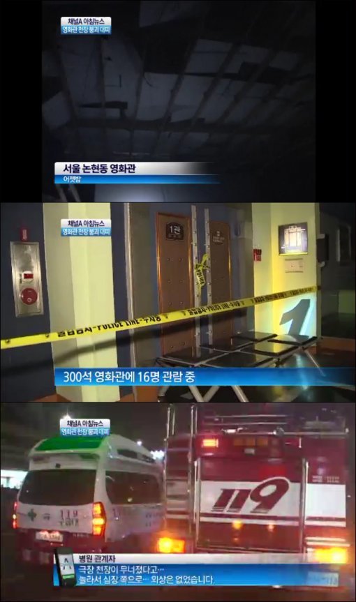 영화관 천장붕괴 사고로 6명 부상. 사진=채널A 보도화면 캡쳐