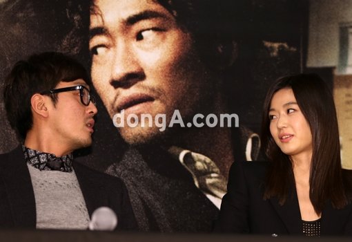 배우 하정우(왼쪽)와 전지현이 21일 오후 서울 왕십리 CGV에서 열린 영화 ‘베를린’ 언론배급 시사회에 참석해 담소를 나누고 있다.