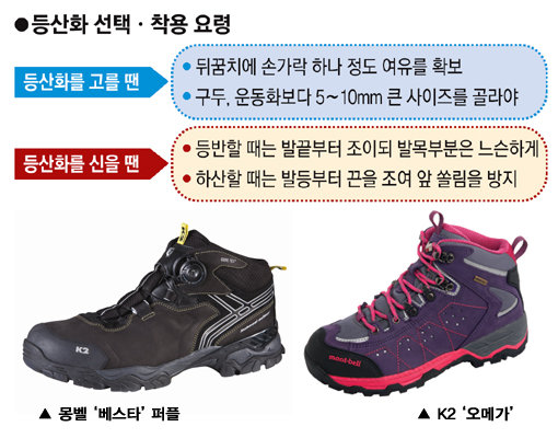 우선 구두나 운동화보다 큰 것을 고르는 게 상식이다. 보통 5∼10mm 정도 큰 것이 좋다. 평지에서 신었을 때 발가락이 등산화 앞부분에 닿지 않아야 한다. 평소 구두나 운동화를 타이트하게 신는 사람은 10mm, 헐겁게 신는 사람은 5mm 정도 큰 사이즈를 선택한다.