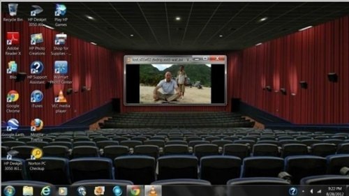 바로 컴퓨터 바탕화면에 영화관 좌석 뒤쪽에서 바라본 사진을 깔아놓는 것. 영상 플레이어를 절묘한 위치에 두어 영화관 느낌이 나도록 연출했다.