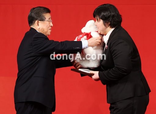 역도 장미란이 31일 오후 서울 용산구 하얏트호텔 그랜드볼룸에서 열린 ‘코카-콜라 체육대상’ 시상식에서 공로상을 수상하고 있다.