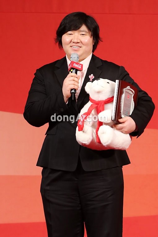 역도 장미란이 31일 오후 서울 용산구 하얏트호텔 그랜드볼룸에서 열린 ‘코카-콜라 체육대상’ 시상식에서 공로상을 수상하고 있다.