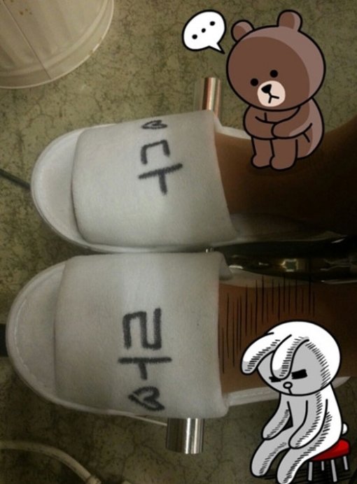 사진에는 산다라박이 자신의 이름을 크게 ‘산다’, ‘라박’이라고 적은 슬리퍼 한 쌍이 놓여있다. 이 슬리퍼 사진으로 멤버들과 함께 생활하다 여러개의 슬리퍼 때문에 혼동스러웠던 점을 재치있게 표현하고 있는 것.