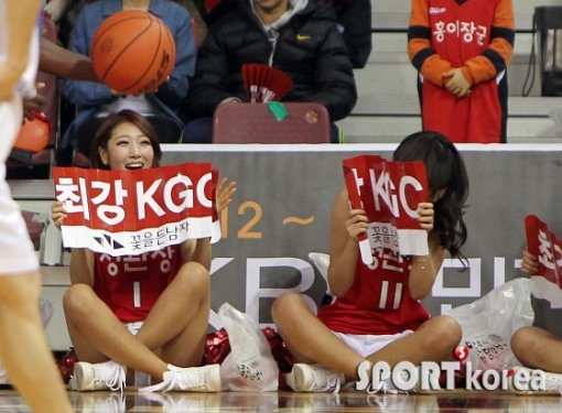 1일 오후 안양 실내체육관에서 열린 `2012-2013 KB 국민카드 프로농구` 안양 KGC 인삼공사와 서울 삼성 썬더스의 경기에서 KGC 치어리더가 날아오는 공을 피하고 있다.