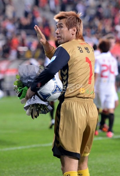 김병지가 새롭게 둥지를 튼 전남에서 철저한 자기 관리로 어린 선수들에게 프로 의식을 심어주고 있다. 지난 해 경남 소속으로 K리그 600경기 출장 기록을 세웠을 때 모습. 스포츠동아DB