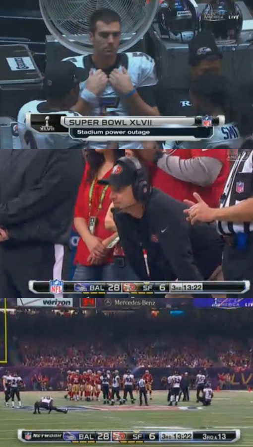 하지만 이 경기 3쿼터 1분40초경 발생한 정전으로 무려 36분간 경기가 중단됐다. 경기장 일부 조명이 꺼졌지만, 언제 경기가 재개될지 알수 없는 선수들은 밝은 곳을 찾아 끊임없이 몸을 푸는 모습이었다. 경기장을 가득 메운 관중들과 시청자들 역시 하염없이 광고를 보며 기다렸다. 덕분에 ‘광고주만 신난’ 슈퍼볼이라는 현지의 평가도 나왔다. 정전 이유는 아직 알려지지 않았다.