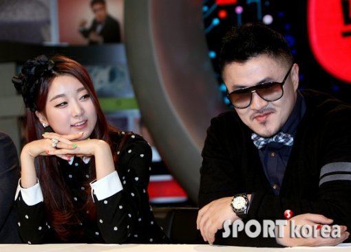 달샤벳 수빈이 6일 오후 서울 상암동 CJ E&M에서 열린 tvN 새 예능프로그램 ‘눈썰미’ 기자간담회에 참석해 가수 데프콘(오른쪽)을 바라보고 있다.