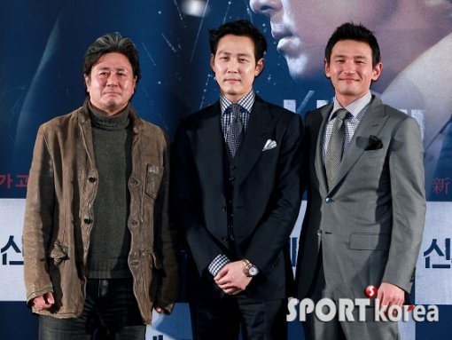 6일 오후 서울 왕십리CGV에서 열린 영화 ‘신세계’(감독 박훈정) 언론 시사회에 참석한 배우 최민식, 이정재, 황정민(왼쪽부터)이 포즈를 취하고 있다.