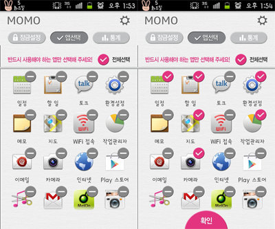시간을 설정했다면 앱선택 메뉴를 눌러 잠금 설정할 앱을 편집하자. 잠글 앱은 '-'표시를, 잠그지 않을 앱은 'v'표시를 하면 된다.