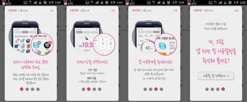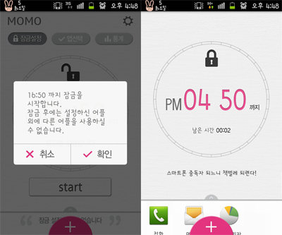스마트폰 중독방지 애플리케이션 '모모(Mobile Monitoring)'의 도움을 받는 것도 한 방법이다. 모모는 설정한 시간 사이에는 특정 앱을 사용할 수 없도록 한다. 쉽게 말해 '스마트폰 앱 잠금시간'을 설정하는 것이다. 모모 앱은 구글 플레이스토어와 T스토어, U플러스스토어, 네이버앱스토어에서 내려 받을 수 있다. 안드로이드 운영체제만 지원하며 아이폰을 비롯한 iOS 기기는 지원하지 않는다. 개발사 측은 앞으로도 iOS를 지원할 계획은 없다고 한다. 그리고 무료버전과 유료버전(1,900원)이 있지만 현재로써 두 버전의 차이는 크게 없다. 광고 표시의 유무뿐이다.