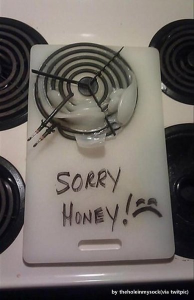 요리를 하던 남편이 가스 레인지의 뜨거운 코일을 도마에 얹어 놓았던 것. 때문에 도마가 녹아 들어간 모습이다.