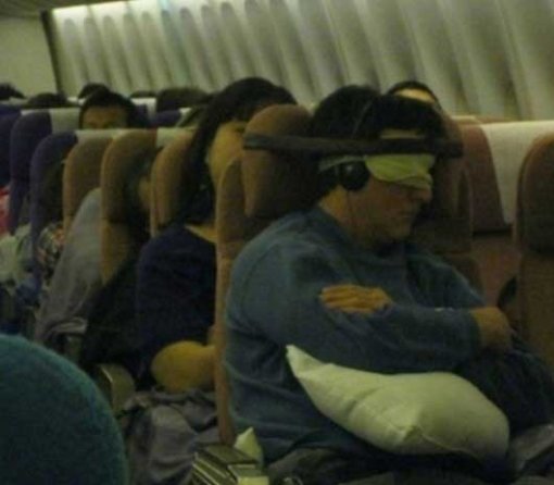 사진 속 남성은 안대까지 쓰고 잘 준비를 모두 마친 뒤 자신의 좌석에 허리띠를 매 머리를 고정한 기발한 방법으로 잠을 청했다.