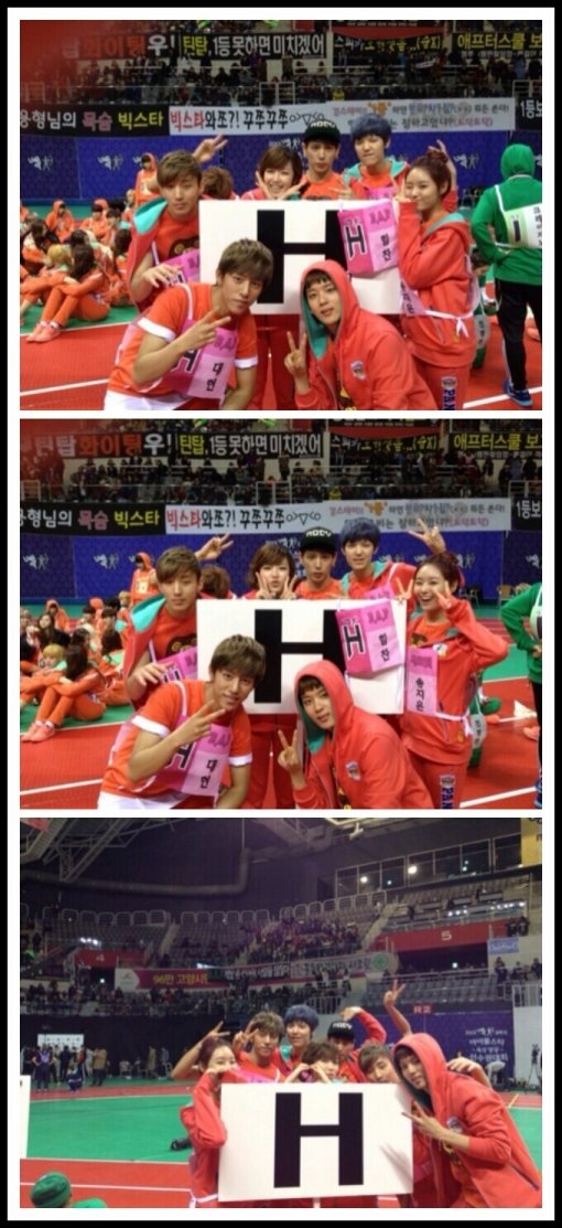 공개된 사진에는 같은 소속사 아티스트들을 한 팀으로 배정해주는 ‘아육대’의 관례에 따라 함께 팀을 이룬 시크릿과 비에이피(B.A.P)가 주황색 계열의 화사한 단체복을 입고 승리의 V자를 그리고 있다.
