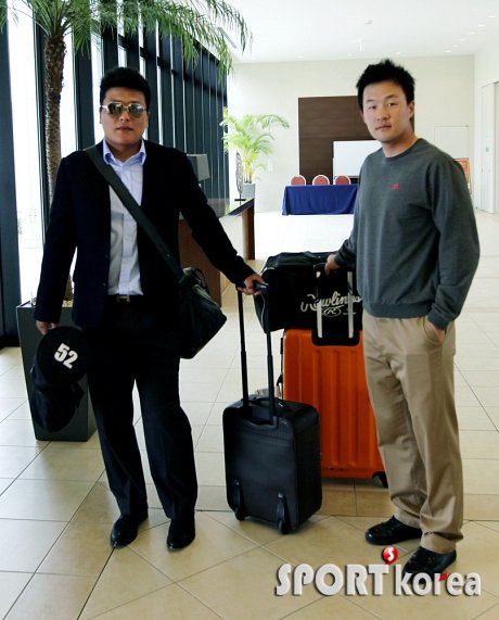 한화 김태균이 9일 오후 일본 오키나와 전지훈련을 마치고 WBC 합류를 위해 오키나와 나하공항을 통해 한국으로 출국하기전 룸메이트 이여상의 배웅을 받고 있다.