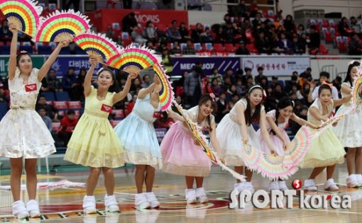 `2013 KB 국민카드 프로농구` 울산 모비스 피버스와 창원 LG 세이커스의 경기가 19일 오후 울산 동천체육관에서 열렸다. 경기전 모비스 치어리더들이 설날을 맞아 한복을 입고 멋진 오프닝 공연을 펼치고 있다.