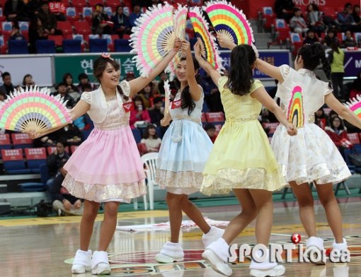 `2013 KB 국민카드 프로농구` 울산 모비스 피버스와 창원 LG 세이커스의 경기가 19일 오후 울산 동천체육관에서 열렸다. 경기전 모비스 치어리더들이 설날을 맞아 한복을 입고 멋진 오프닝 공연을 펼치고 있다.