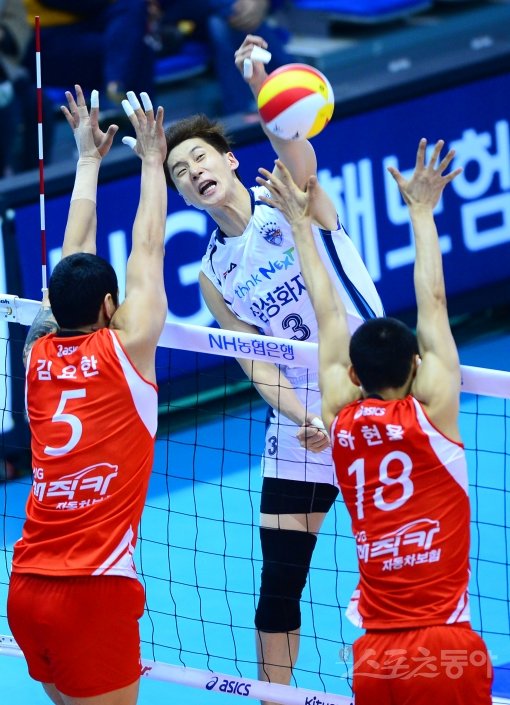삼성화재 박철우가 안간힘을 쓰는 모습이 인상적이다. LIG손해보험의 블로커를 앞에 두고 한 뼘 높은 스파이크를 날리고 있다. 대전|박화용 기자 inphoto@donga.com 트위터@seven7sola