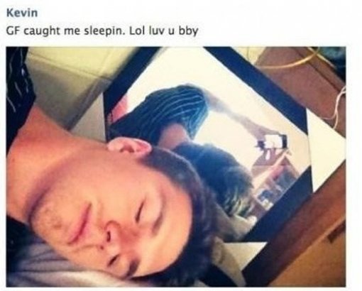 하지만 ‘요즘 유행하는 셀카’ 사진에서 침대에 누워 자고 있는 모습은 남이 찍어준 사진이 아닌 셀카 사진. 남성 뒤에 있는 거울에는 혼자서 직접 사진을 촬영하는 모습이 비치고 있다. 요즘 유행하는 셀카는 여자친구가 촬영한 것처럼 찍은 사진인 것이다.