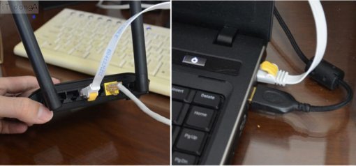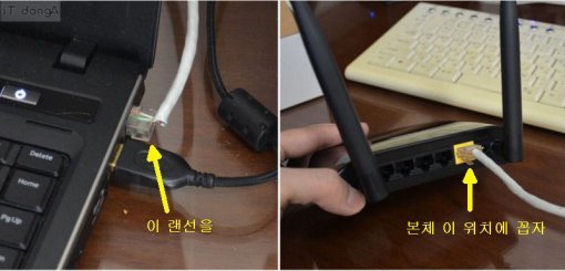 그리고 박스 안에 동봉되어 있는 랜선을 꺼내 본체 노란색 포트 옆 1, 2, 3, 4 숫자가 적혀 있는 포트 중 아무 곳에나 꼽자. 그리고 랜선 반대편을 방금 전 랜선을 뺀 PC 포트에 꽂으면 된다.