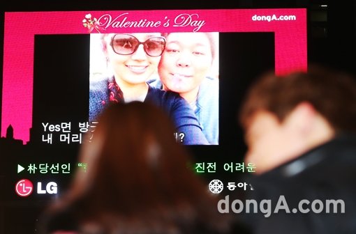 14일 오후 서울 중구 광화문 사거리 앞에서 열린 ‘동아닷컴과 함께하는 밸런타인데이 프러포즈’ 행사에서 참가자들이 대형 전광판을 통해 영상을 보고 있다.