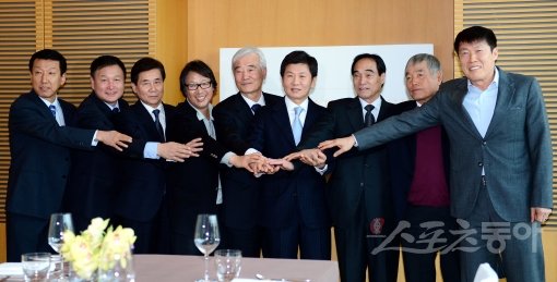 축구협회 정몽규 회장과 전현직 국가대표 감독들이 14일 오찬에 앞서 화합을 다짐하는 포즈를 취하고 있다. 왼쪽부터 최강희,