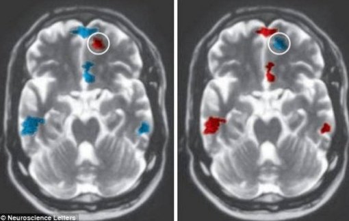 보도에 따르면 공개된 사진 속 좌측이 3년 이상 사귄 사람, 우측이 그렇지 않은 사람의 뇌 스캔 이미지이다.
