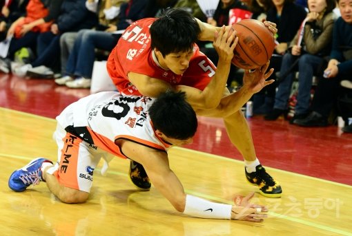 SK 김선형(위)과 전자랜드 이현민이 15일 잠실학생체육관에서 열린 경기에서 루스 볼을 다투고 있다. 잠실|박화용 기자 inphoto@donga.com 트위터 @seven7sola