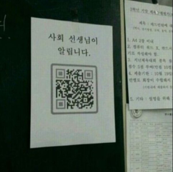 해당 사진을 살펴보면 학교 교실의 게시판으로 보이는 곳에 ‘사회 선생님이 알립니다’라는 메시지와 함께 QR 코드가 크게 자리 잡고 있다.