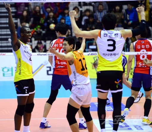17일 아산 이순신체육관에서 열린 프로배구 남자부 5라운드 경기에서 대한항공의 7연승을 저지한 러시앤캐시 선수들이 환호하고 있다. 아산|박화용 기자 inphoto@donga.com 트위터 @seven7sola