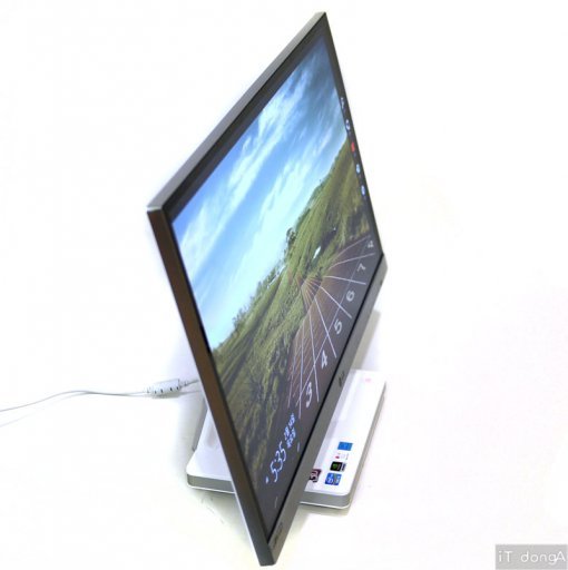 화면 배젤(테두리)의 두께는 11.3mm에 불과해서 화면을 켜면 상당히 세련된 느낌을 주는 것과 동시에 공간의 낭비도 최소화했다. 그리고 주요 PC 부품이 모여있는 스탠드 부분의 크기도 여타 올인원PC에 비해 작은 편이라 얼핏 봐서는 일반적인 LCD 모니터를 보는 것 같다.