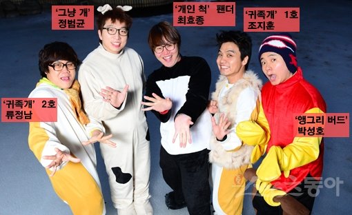 KBS 2TV ‘개그콘서트-애니뭘’의 류정남·정범균·최효종·조지훈·박성호(왼쪽부터)는 다양한 동물로 변신해 동물의 애환을 개그로 승화시킨다. ‘애니뭘’은 장난스런 아이디어 회의로 탄생했지만 ‘개콘’의 인기몰이 후보로 손꼽히고 있다. 박화용 기자 inphoto@donga.com 트위터@seven7sola