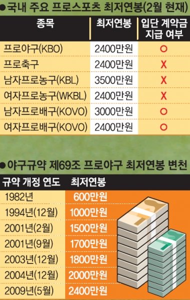 프로야구는 1982년 출범 당시 최저연봉 600만원으로 출발했다. 최저연봉은 600만원이었지만 초창기 신인드래프트를 통해 입단하는 선수의 기본연봉은 사실상 1200만원이었다. 서울 시내 집 한 채를 살 수 있는 수준이었다. 그러나 30년이 지났지만 최저연봉은 사실상 딱 2배 올랐을 뿐이다.<표 참조> 그나마 2009년 최저연봉을 2000만원에서 2400만원으로 400만원 올린 것도 당시 야구인 출신 삼성 김응룡 사장(현 한화 감독)의 주장에 힘입은 바 크다.
