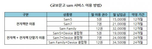 sam 서비스는 인터넷교보문고(www.kyobobook.co.kr) 또는 전국 오프라인 매장에 설치된 ‘샘존’에서 가입할 수 있다.