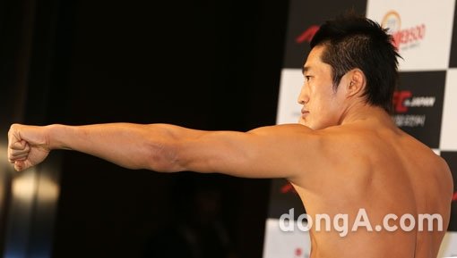 코리안 파이터 3인방 김동현, 강경호, 임현규가 다시 뭉쳤다. 격투기 선수 김동현이 22일 오후 서울 마포구 CJ E&M 미디어홀에서 열린 수퍼액션 ‘UFC in Japan’ 출정식에서 포토타임을 하고 있다.