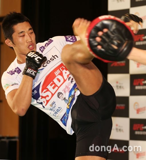 코리안 파이터 3인방 김동현, 강경호, 임현규가 다시 뭉쳤다. 김동현이 22일 오후 서울 마포구 CJ E&M 미디어홀에서 열린 수퍼액션 ‘UFC in Japan’ 출정식에서 오픈워크아웃을 선보이고 있다.