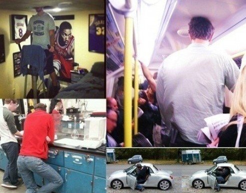 사진 속에는 일상생활에서 키가 커 불편한 모습들이 담겨있다. 키가 큰 한 남성은 집에서 운동을 하기 위해 천장을 뚫었고 또 다른 남성은 천장에 머리가 닳은 채 지하철을 타고 있다.