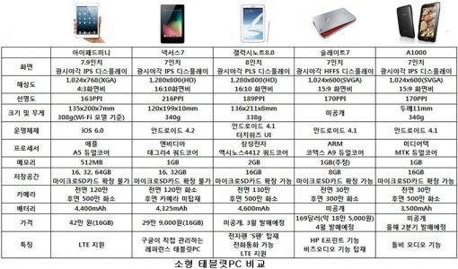 애플 '아이패드미니'와 구글 '넥서스7' 위주로 돌아가던 소형 태블릿PC 시장에 삼성전자와 HP가 '갤럭시노트8.0'과 '슬레이트7'이라는 도전장을 내밀었다. 레노버도 'A1000'이라는 제품으로 한발 걸쳤다. 다섯이 어떤 제품인지 특징 및 장단점을 간략하게 비교한다.