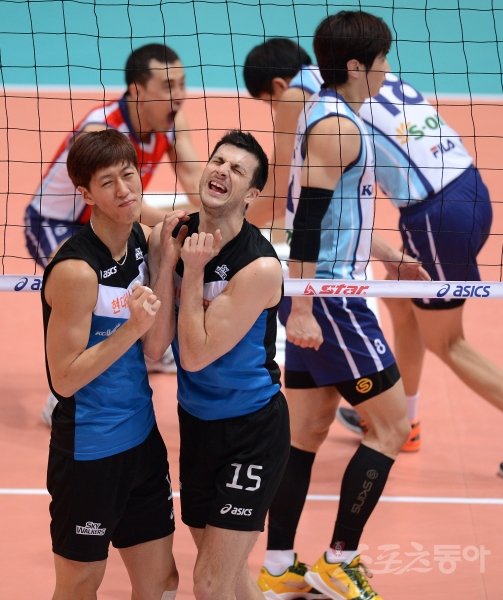 현대캐피탈 가스파리니(오른쪽)와 윤봉우가 27일 인천 도원실내체육관에서 벌어진 대한항공과 경기에서 상대 속공 때 블로킹 타이밍을 놓친 뒤 아쉬워하고 있다. 인천|김종원 기자 won@donga.com 트위터@beanjjun