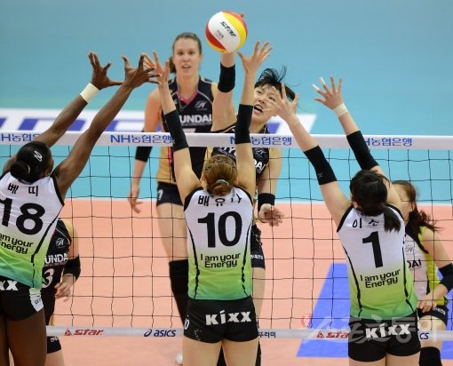 현대건설 양효진이 28일 열린 GS칼텍스와 경기에서 상대 블로커를 앞에 두고 공격을 시도하고 있다. 수원|김종원 기자 won@donga.com 트위터 @beanjjun