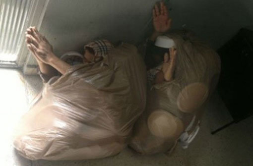 공개된 사진 속에는 두 명의 사람이 대형 비닐봉지 안에 들어가 손과 머리만을 조금 내놓고 있다.