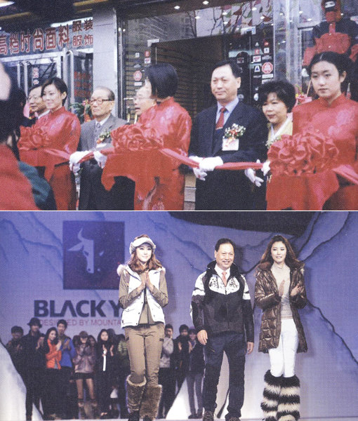 아웃도어 기업 (주)블랙야크가 창립 40주년 만에 연간 매출액 6250억원의 글로벌 명품기업으로 성장했다. 1998년 중국 베이징에 오픈한 블랙야크 1호점(위). 아래는 2011년 슈퍼모델과 함께 패션쇼를 벌이고 있는 강태선회장. 사진제공|블랙야크