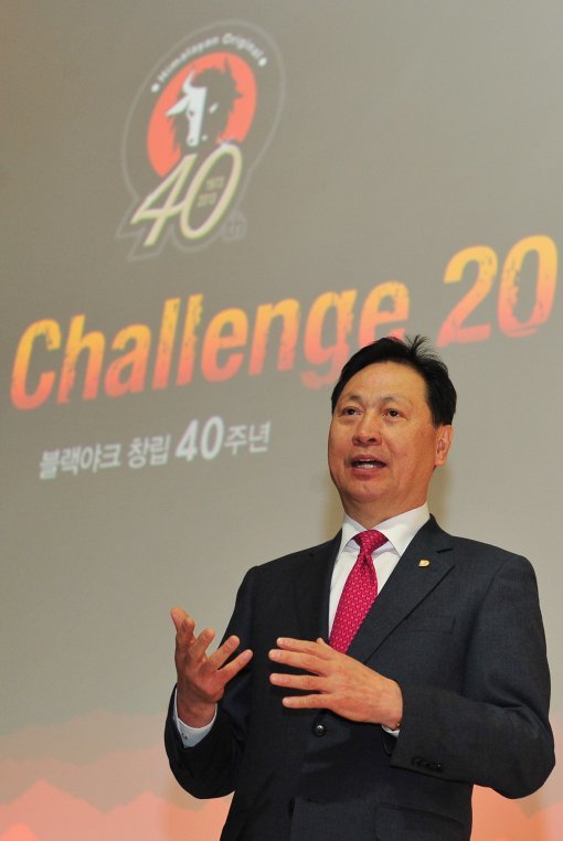 블랙야크 강태선 회장이 5일 서울 연희로 그랜드힐튼에서 열린 창립40주년 기자간담회에서 2020년까지 매출 4조원 달성, 글로벌 1위 기업 도약에 대한 비전을 설명하고 있다. 사진제공|블랙야크